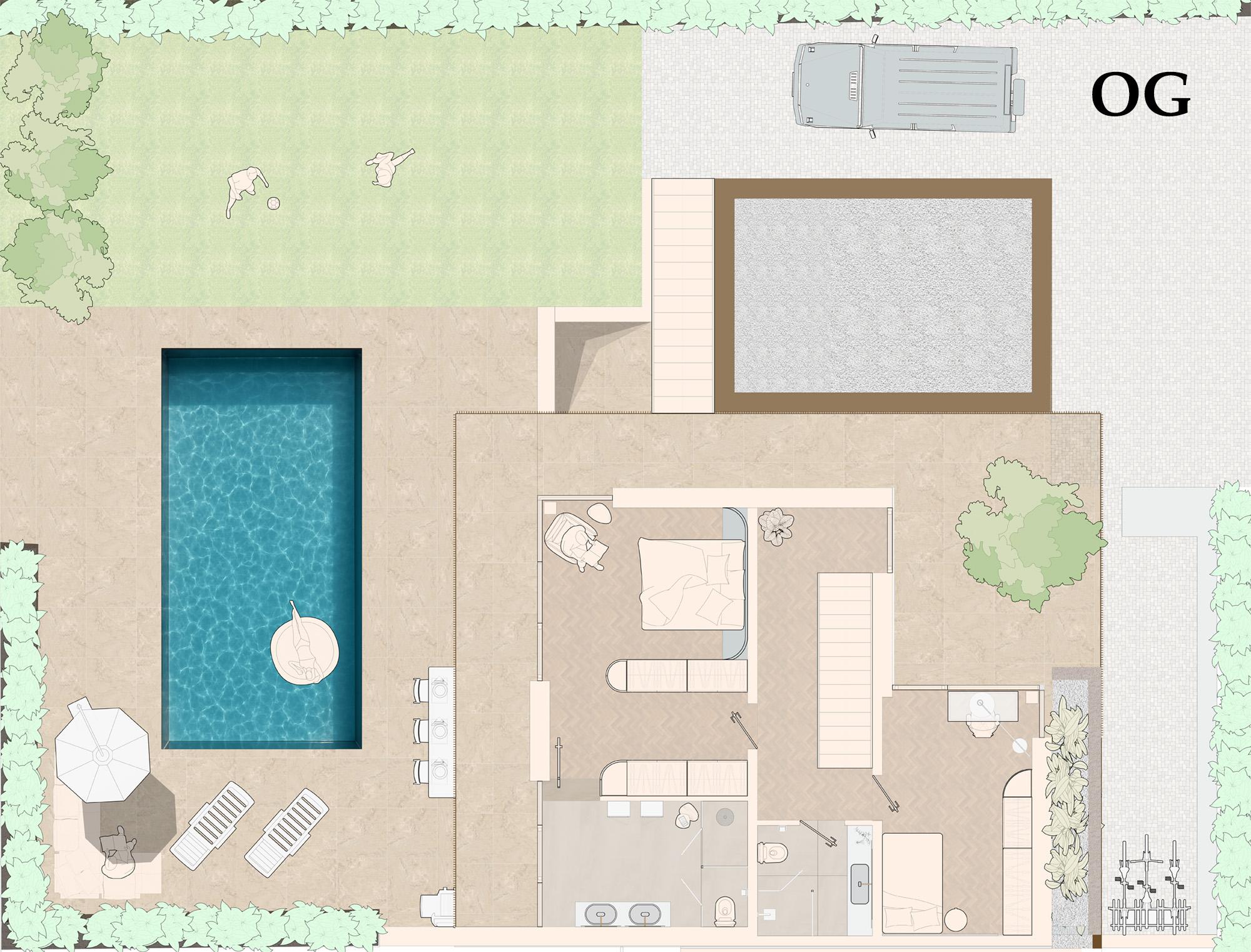– Swimmingpool 3,5 x 8,0 Meter mit Gegenstromanlage, Wasserfall und Poolabdeckung