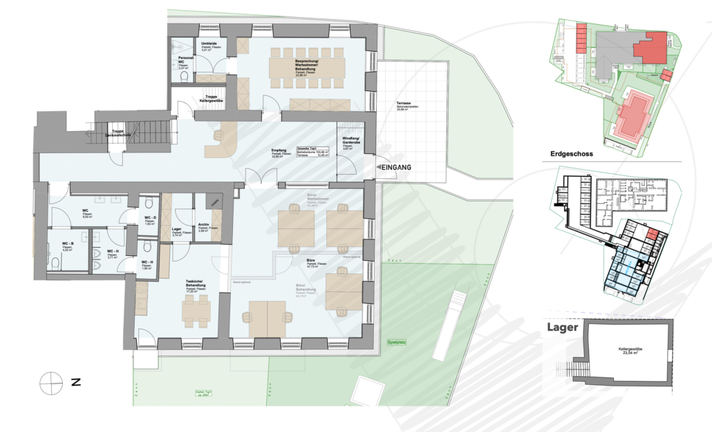 Im Zentrum stehen flexibel gestaltbare Gewerbeflächen, die optimalen Raum für Gastronomie, Büros, Ordinationen, Praxen, Kanzleien oder andere Dienstleistungen bieten.